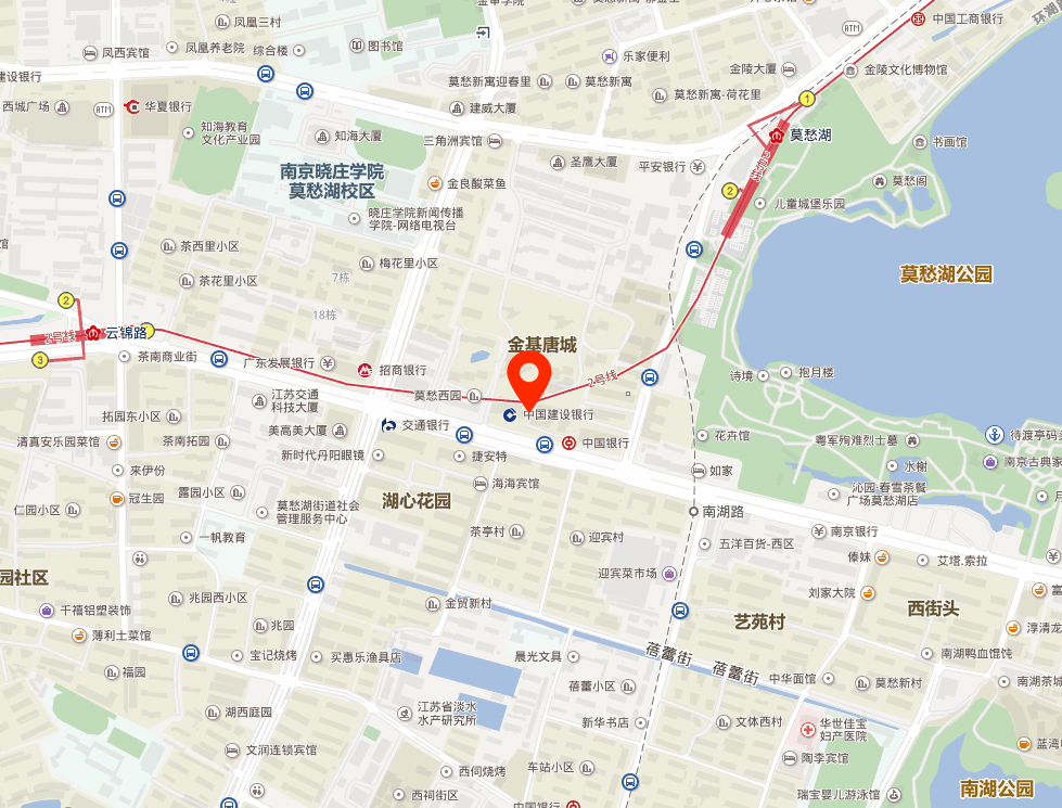 周边信息 酒店 清沐酒店(南京水西门云锦路地铁站店)、骏怡连锁酒店(莫愁湖云锦路地铁站店)、芒果酒店(莫愁湖地铁站店)、南京张帅宾馆(北圩路)、清沐酒店(莫愁湖晓庄学院店)、南京金陵大厦(汉中门大街店)、海友酒店(凤凰西街店)、爱美达假日酒店、清沐连锁酒店(南京莫愁湖地铁站店)、肯定铂金酒店(南京水西门大街莫愁湖店)。 美食 麦当劳(水西门餐厅)、陈家鸭子店(文体西路店)、王海龙韩式石锅拌饭(水西门大街)、观茶逸品、胖子砂锅(南湖店)、佰人王串串香(水西门店)、茶南面馆(湖西街店)、佰人王串串香(水西门店)、茶南面馆(湖西街店)、厨娘当家土菜私房菜(湖西街店)、民间私房菜(水西门大街店)、家宴私房菜(水西门大街店)。 银行 中国建设银行(南京水西门大街支行)、交通银行(南京水西门支行)、中国农业银行(南京茶亭东街支行)、浙江稠州商业银行(南京莫愁湖支行)、华夏银行(南京建邺支行)、平安银行(南京莫愁支行)、南京银行(南京分行南湖支行)、中国银行(南京南湖支行)。 购物 五洋百货时尚广场、金鹰特惠中心(汉中门店)、南京中海环宇城、万达广场(建邺店)、南京建邺吾悦广场。 超市 好又多(水西门大街店)、惇品生活超市、华联超市(莫愁西路店)、华联超市(北圩路店)、苏果超市(南湖路特许店)、加加超市。 学校 南京市南湖第二小学、南京市南湖第二中学、南京市芳草园小学(凤凰校区)、南京第二十九中学(初中部)、凤凰花园城小学(力学小学分校)。 医院 江苏省第二中医院、江苏省人民医院、江苏省中医院、南京远大中医院。 部分入驻企业 匡合国际北京炎黄联合国际工程设计有限公司、南京印合图文制作有限公司 ... ...